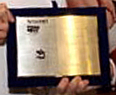 Material - A golden miniature copy of the 'Tuttosport' newspaper opened double spread with the page on the right having the award details engraved. All on a dark blue presentation stand.